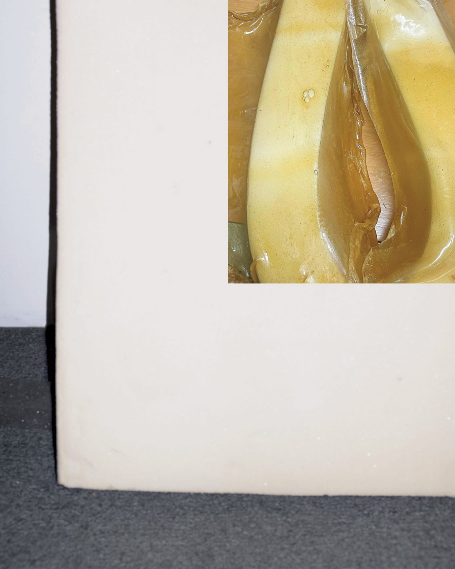 At the exhibition center is flexible polyurethane memory foam serves as both structure and metaphor for exposed corporeality. It absorbs impact, yields, and slowly returns to form. Punkstiņa treats it as a model of “essence”: mutable yet retentive, marked by experience but resistant to permanent distortion. Coated, pierced, or coupled with intrusive elements—bamboo arrows, taxidermy fragments, bicycle parts, synthetic hair—the flesh-like material becomes a site of exposure. At times, it is sheathed in a honeyed, porous membrane resembling a second skin, suggesting protection without fully sealing the boundary between inside and out.