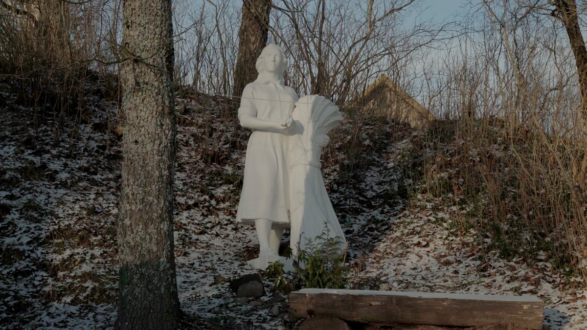 Artist Jaana Kokko’s intervention will be a performative conversation and a screening of her experimental film Green Land (2024) at the Kino Bize cinema. It was shot in the Latvian countryside, in Lādezera parish and Limbaži, and in it the three main characters—former kolkhoz workers Irēna, Veronika, and Lūcija—talk about their experiences in the kolkhozes Ausma and Komunārs. However, the main image of the film is the sculpture Kolhozniece [Collective farm worker], created in 1952 by sculptor Rasma Bruzīte, which personifies both personal and collective memory. While searching for references to monuments in Latvia that depict women, especially kolkhoz workers, the artist came across an archive photo of this Stalin-era sculpture, taken in the Limbaži area. One of the protagonists of Green Land remembered both this sculpture and where it was moved during the de-Stalinization period after its dismantling—the family whose garden the sculpture is located in renamed it Little Milda or Little Milda, who changes her skirts.